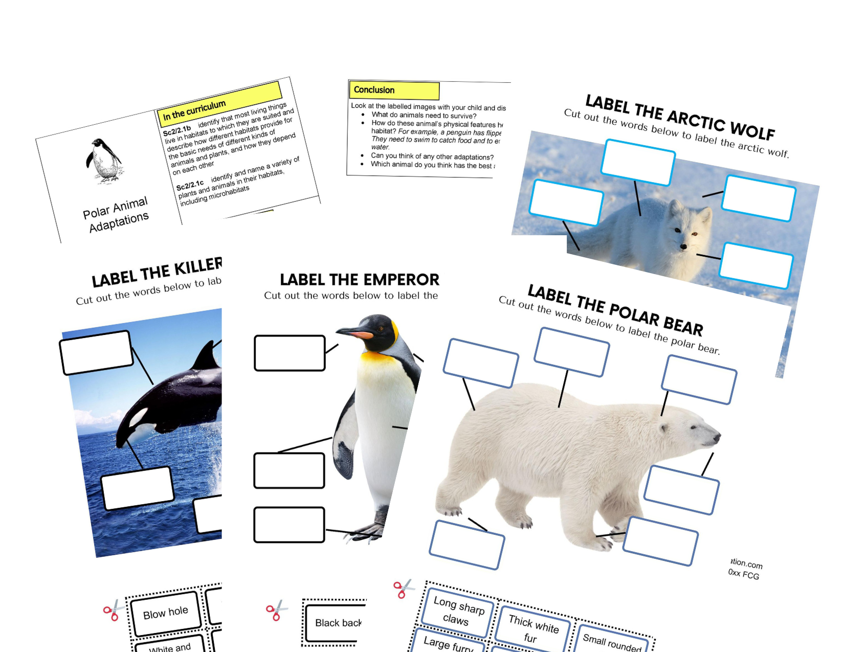 This pack includes seven activity sheets with accompanying lesson plans exploring polar ecosystems, animal adaptations, and food chains — including blubber and waterproofing investigations.