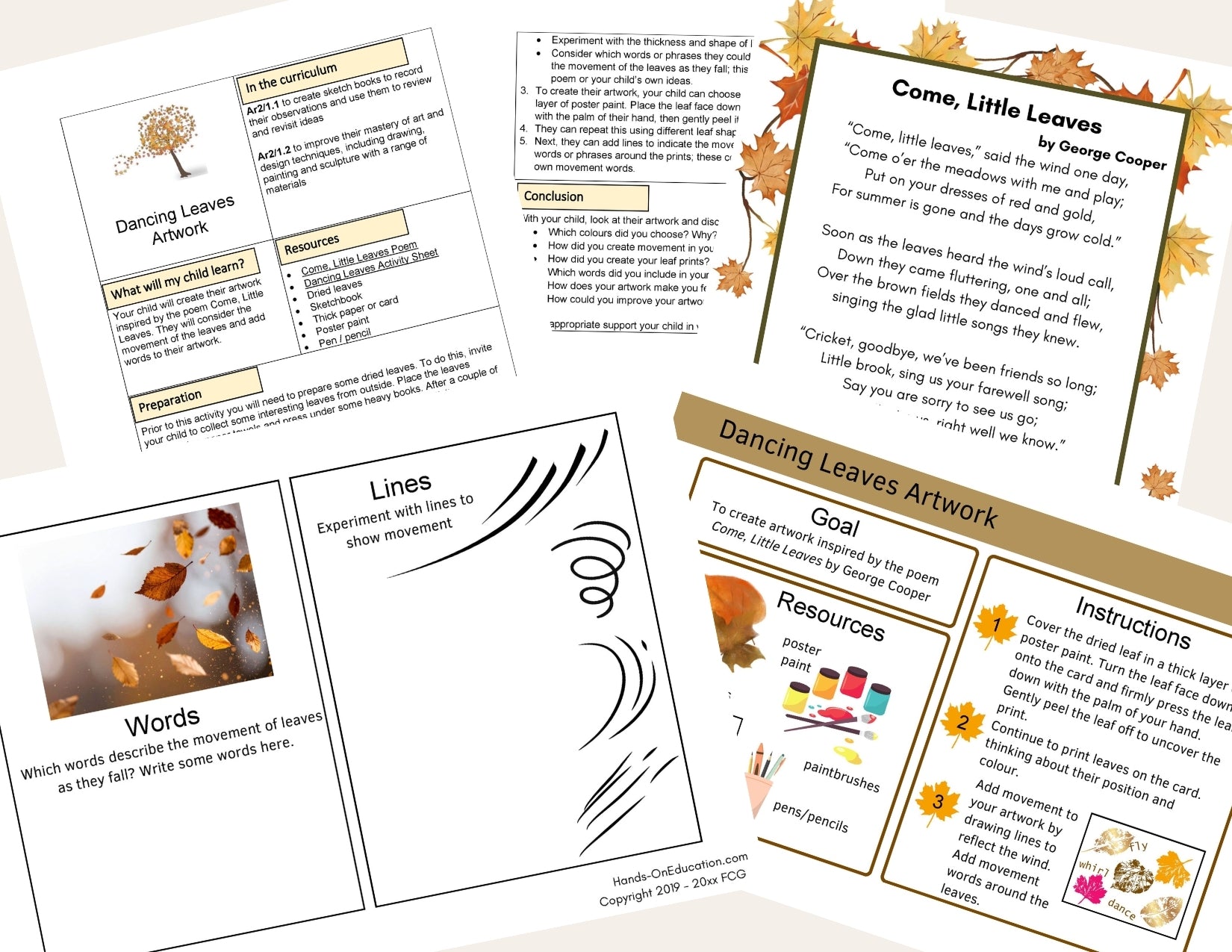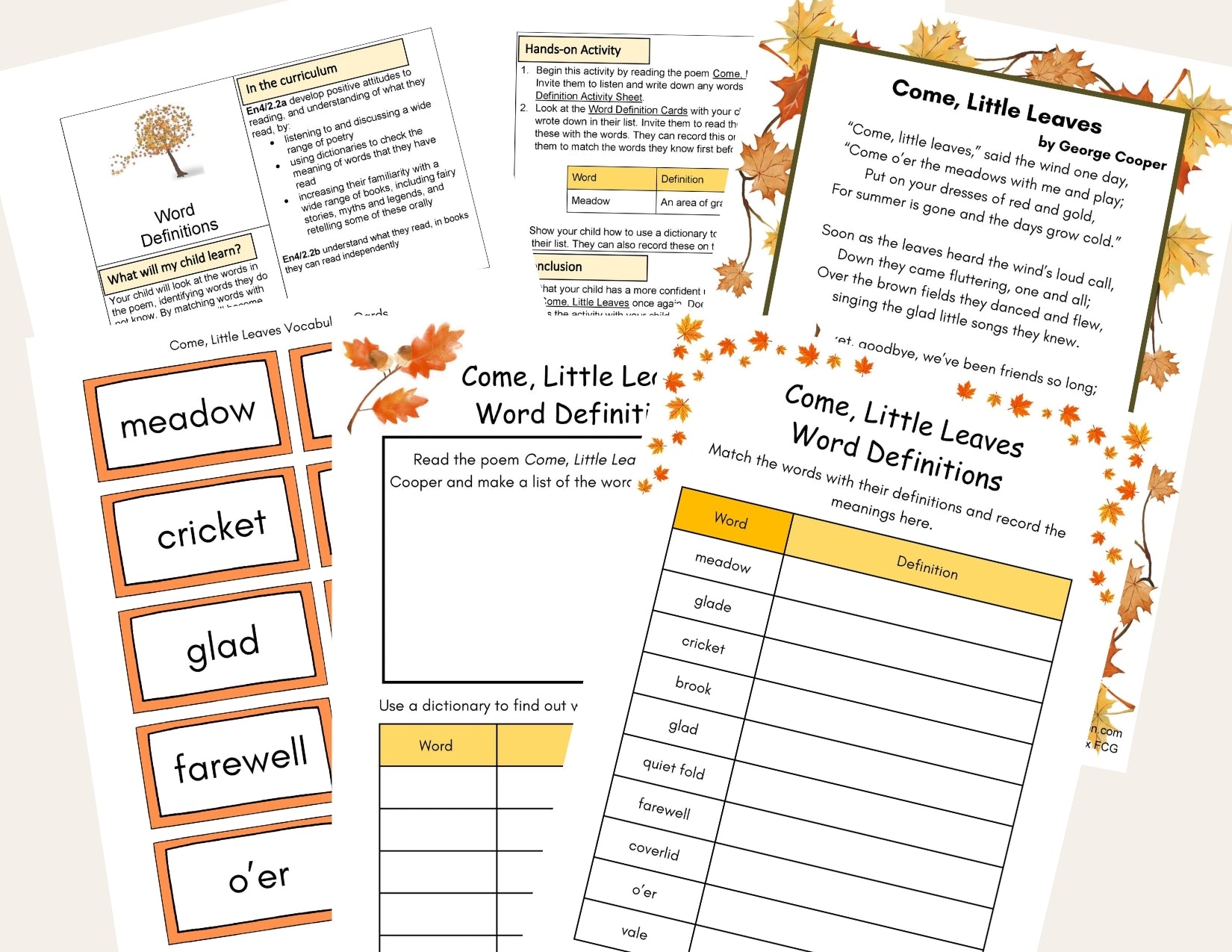 This pack includes 9 activity sheets with accompanying lesson plans exploring the autumn poem Come, Little Leaves by George Cooper through creative English activities.