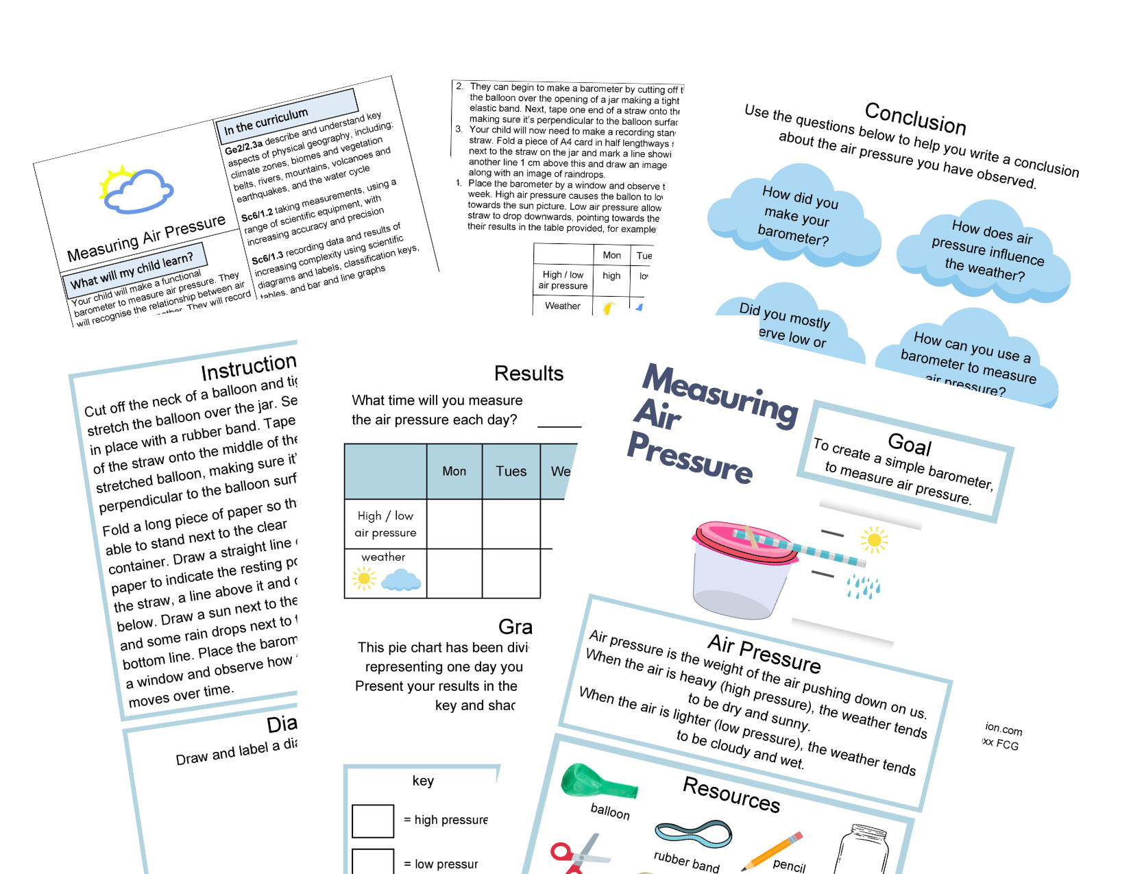 Weather Diary works best set up at the start of the unit as a daily routine — children record observations each morning and analyse patterns at the end of the unit. Make An Anemometer and Measure Wind Direction work brilliantly as a paired outdoor weather station session — set up instruments permanently outside and revisit them throughout the topic. Cloud In A Jar and Tornado In A Jar are excellent teacher-led demonstration experiments that generate real wow moments — run them back-to-back in a single science session. Measuring Air Pressure is the most challenging build — allow a full DT session and test barometers over several days to observe pressure changes before rain.