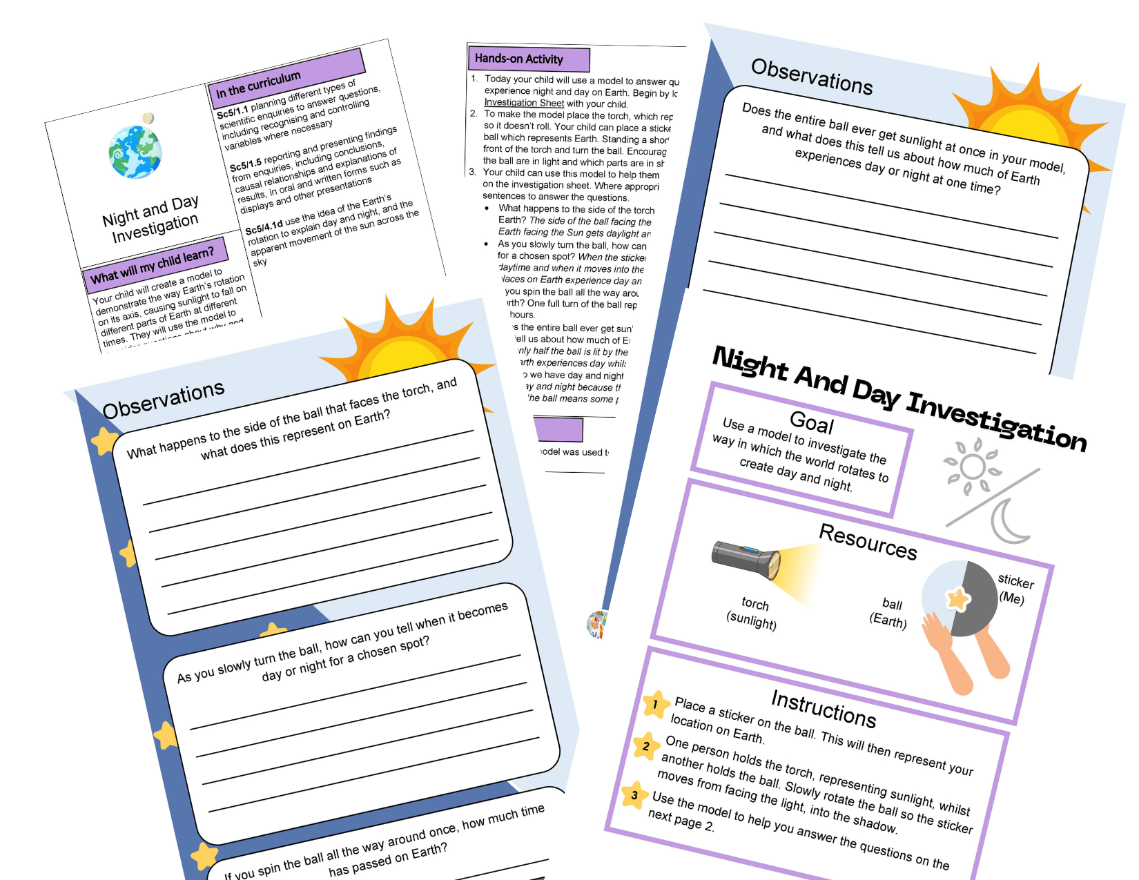 - Night and Day Investigation – Use a ball and torch to explore how Earth’s rotation causes day and night